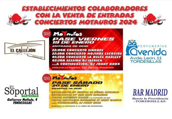 La concentración motera contará con los conciertos de Mojinos Escozíos, la Dulce Harleey, Tarque y la Asociación del Riff o el Espectáculo Renovation Experience con Ricky Galende. Las entradas se podrán adquirir en El Callejón Café & Copas, El Soportal Gastrobar, Perfumerías Avenida y Bar…