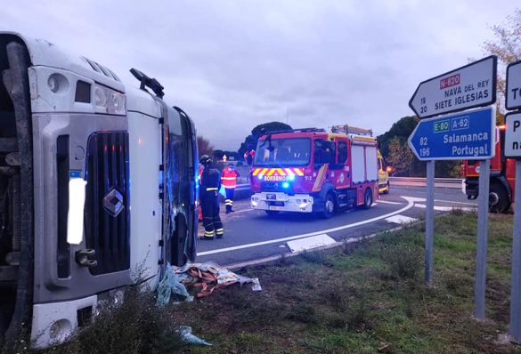 Un camionero, herido grave tras volcar su vehículo en la A-62 a la altura de Tordesillas