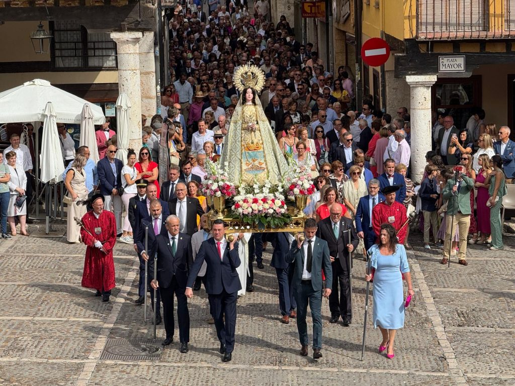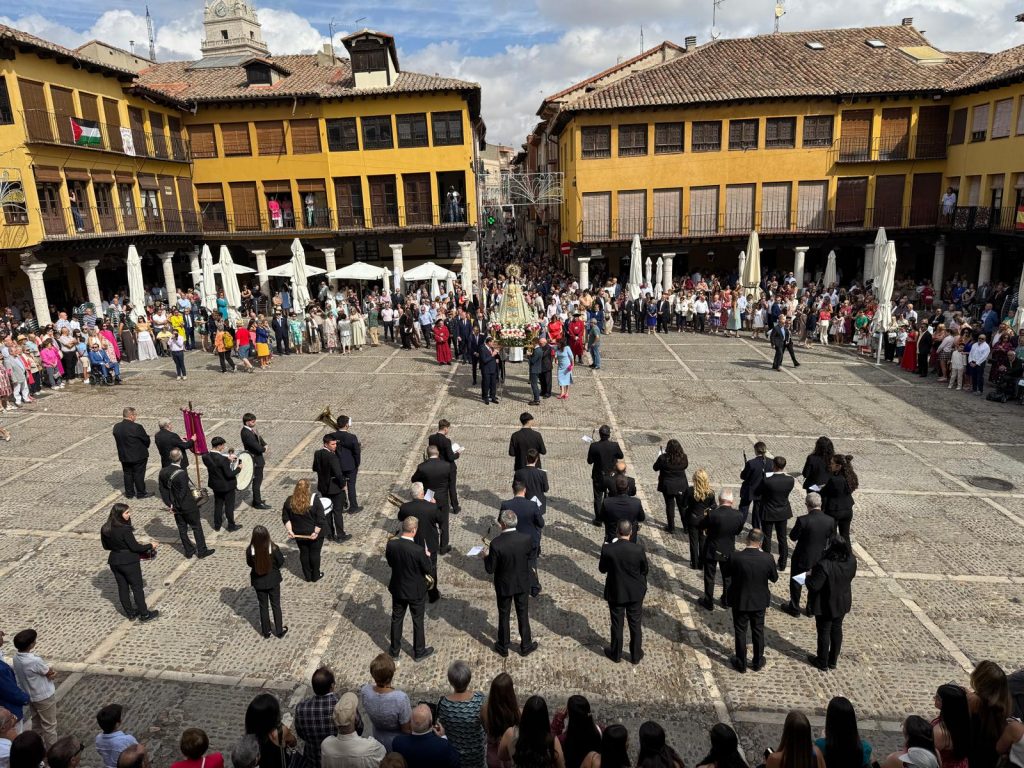 Tras la eucaristía, mayores y pequeños sacaron en procesión a la patrona, y después de devolverla al templo, regresaron ansiosos a la Plaza Mayor para coger sitio para uno de los momentos más esperados de la jornada, el pregón de fiestas que daría el pistoletazo de salida a las fiestas, y acaparando todas las miradas en la balaustrada, el pregonero, el chef Teo Rodríguez, comenzó a recitar el menú de los festejos en un discurso cargado de ingredientes como la nostalgia, los recuerdos, la tradición y el sentir tordesillano.