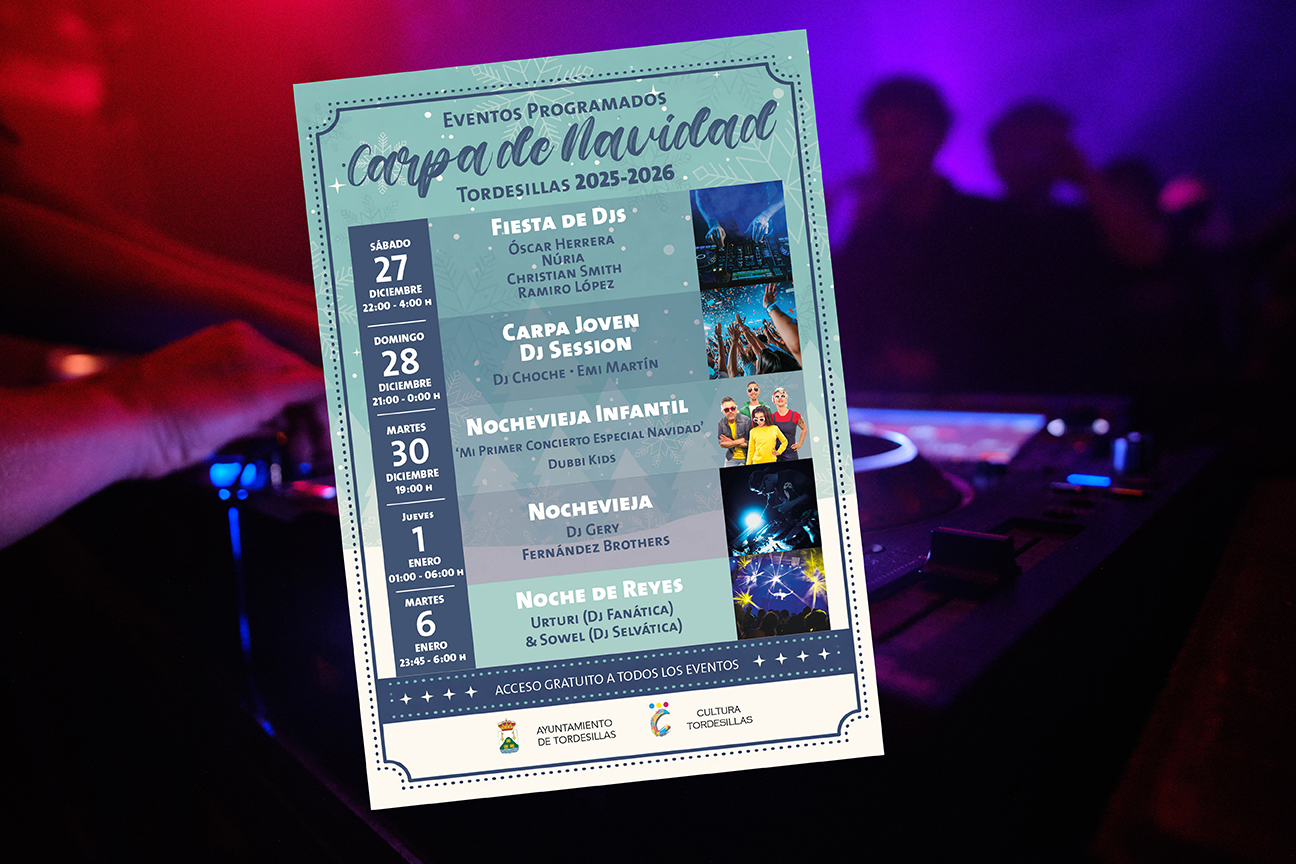 Tordesillas se prepara para vivir unas noches navideñas muy especiales y, además de las citas más señaladas, se ha organizado un programa de eventos musicales que harán de la carpa municipal el centro neurálgico de la música durante estas fechas con un abanico muy diverso de djs, fiestas y conciertos pensados para todos los públicos.