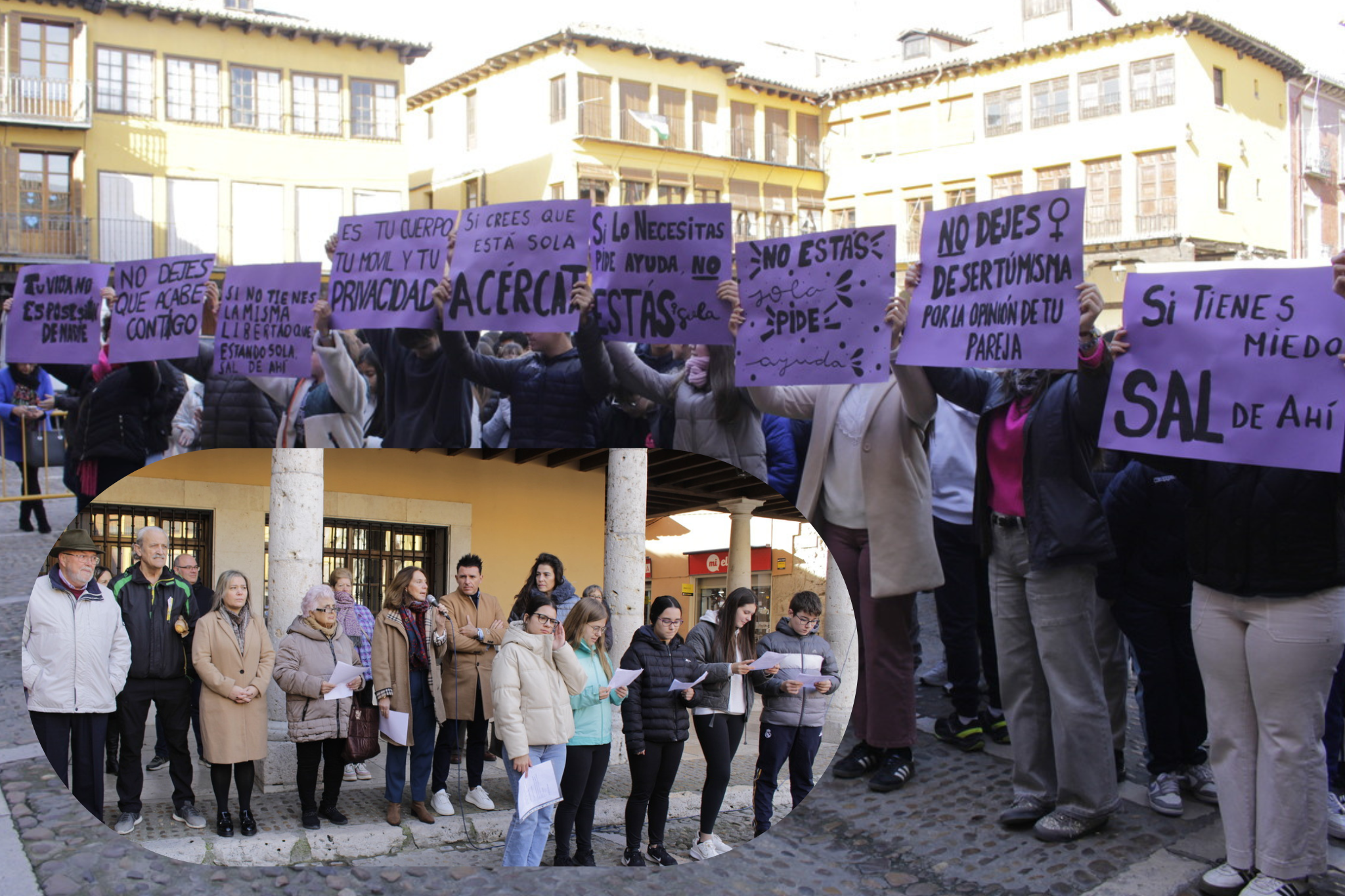 Así, la plaza Mayor de Tordesillas ha sido el escenario de las actividades en torno a esta cita donde se han reunido vecinos del municipio, las autoridades municipales, y los alumnos del IES Juana I de Castilla, quienes han llevado a cabo una presentación con la que querían dar voz, presencia y reconocimiento a las mujeres que sufren o han sufrido violencia. De esta manera, algunos de los estudiantes han leído su propio manifiesto y poema mientras sus compañeros levantaban pancartas con salvas como: ‘No estas sola, pide ayuda’; ‘No dejes que acabe contigo’; ‘Tu vida no es posesión de nadie’ o ‘Si no tienes la misma libertad que estando sola, sal de ahí’, entre otras.