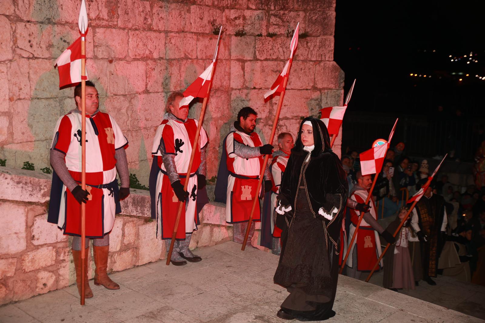 Cabiria Pérez Casado dará vida a la soberana, mientras que la infanta Catalina será encarnada por Ariadna Luengo Miguel. Junto a ellas, también se encontrarán los monteros de Espinosa, las damas de compañía, monjes y personal de palacio. Todos ellos completan una puesta en escena que convierte el casco histórico de Tordesillas en un escenario al aire libre, movilizando a cientos de vecinos.