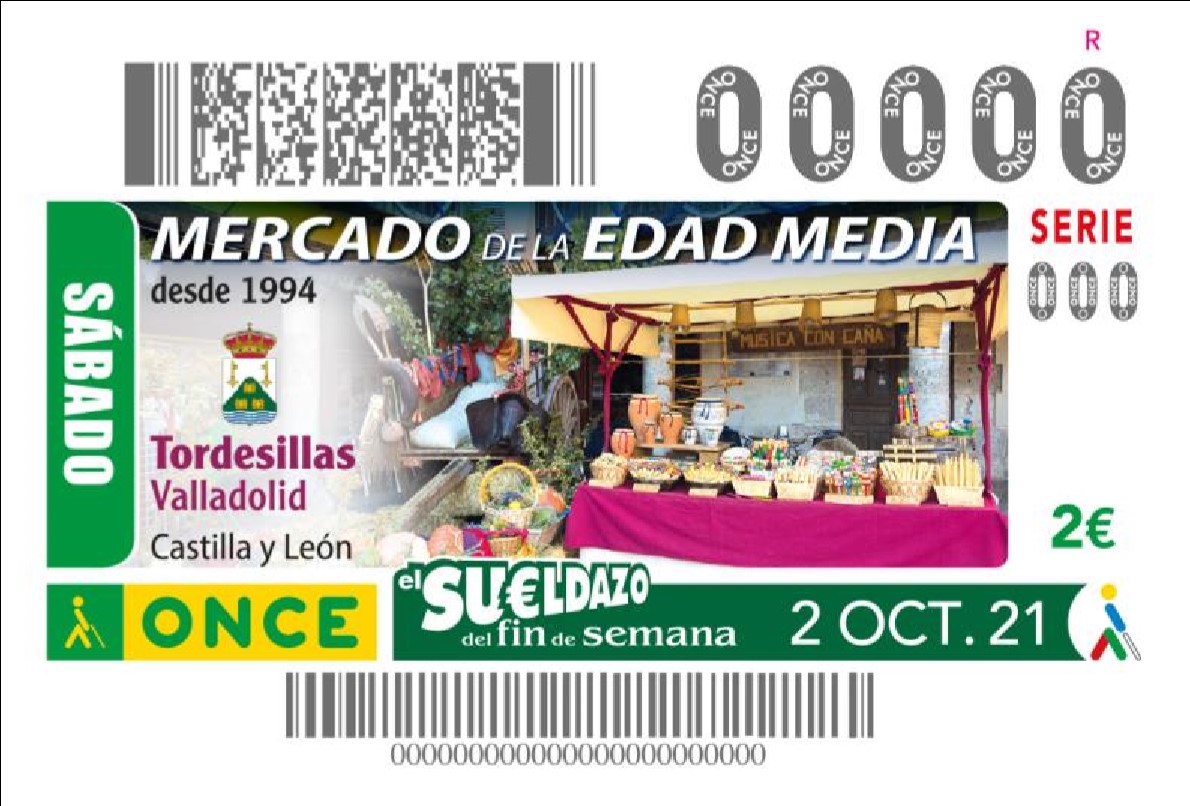 El cupón de la ONCE del sábado, 2 de octubre, se traslada al Mercado de la Edad Media de Tordesillas, que lo protagoniza. Cinco millones y medio de cupones difundirán esta vuelta al medievo.